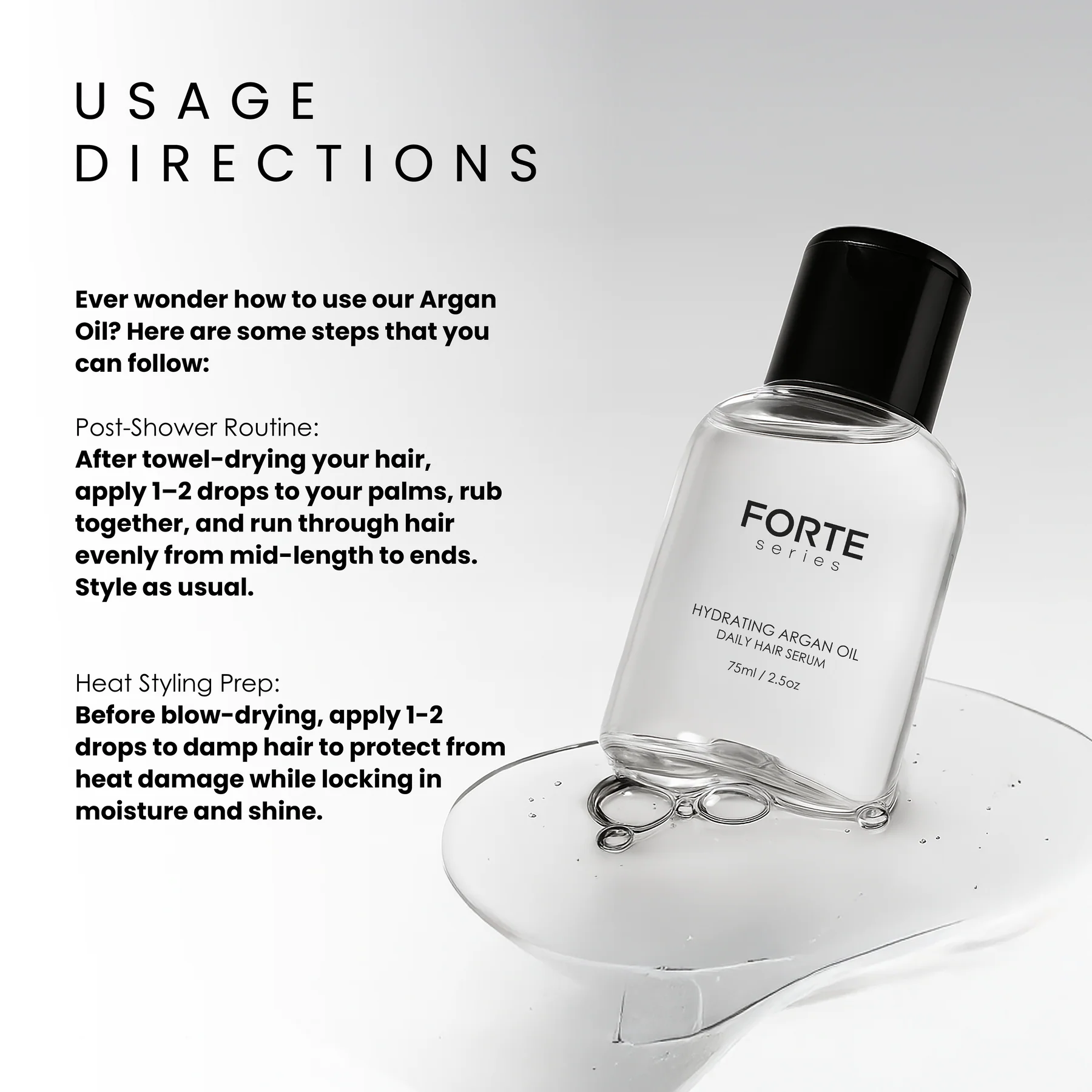 Before blow-drying, apply 1-2 drops to damp hair to protect from heat damage while locking in moisture and shine.