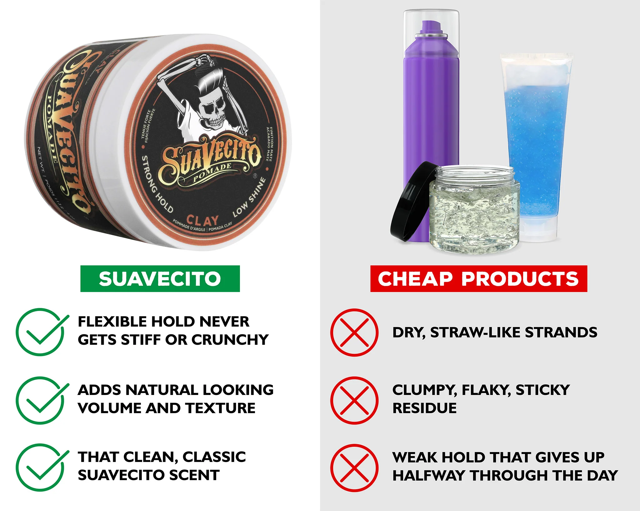 The Suavecito Clay Pomade provides a firm hold and at the same time the popular formability of a classic pomade. For the whole day. You can always use a comb to style your hair as needed, without worrying about it drying out or sticking together quickly like gel does. And the hair feels neat and healthy. This Suavecito hair clay is ideal for matte beach hairstyles, but also for longer hair, for the surfer and beach boy look, and also for everyday business.